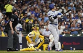 图为,洛杉矶道奇队的大谷章平(右 在第5局击出2分全垒打后正在观看棒球...