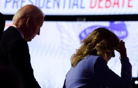 美国民主党总统候选人乔·拜登与第一夫人吉尔·拜登博士走下舞台包括与共和党总统候选人、...